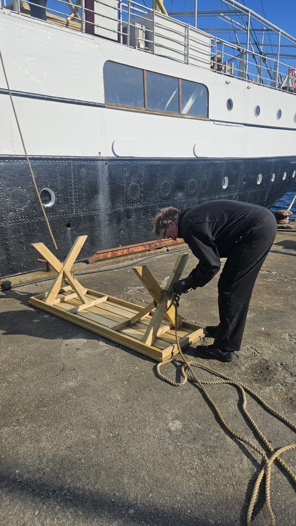 Kreativ bruk av talje-system 22.03.2025 I mars skulle akterdekket vaskes og males, og vi måtte derfor finne en måte å få stuet bort alle bord og benker. Mannskapet laget et midlertidig talje-system som gjorde at vi relativt smertefritt fikk alle bord og benker ned fra øvre dekk og ned til kaien.